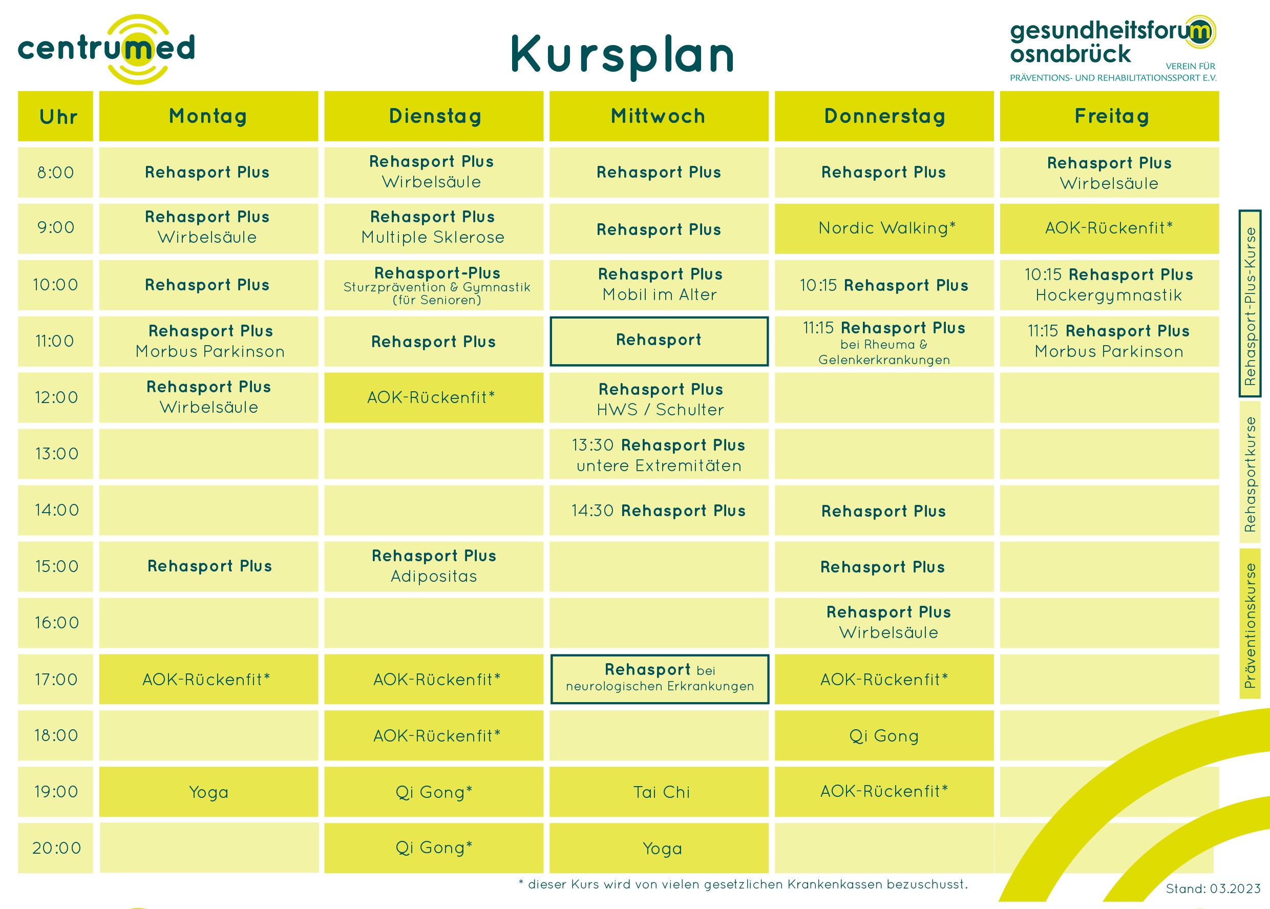 Die Kurse finden im centrumed (Parkstraße 40) oder im centrumed athletik & reha (Iburger Straße 159b) statt. Die genauen Treffpunkte und Uhrzeiten können Sie der Kursbeschreibung entnehmen.