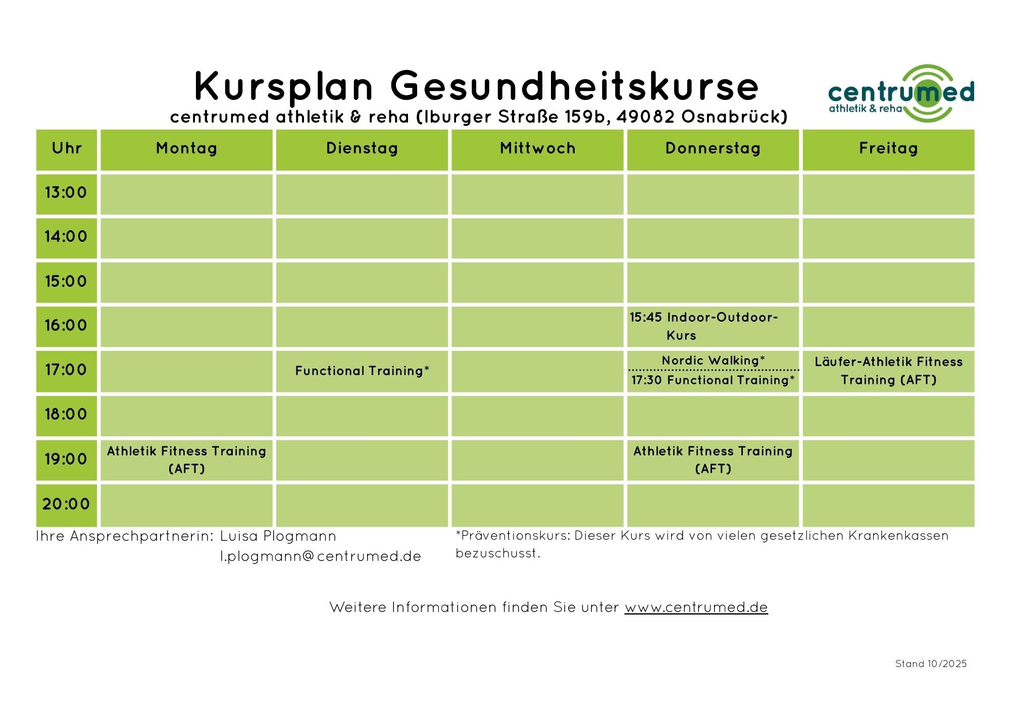 - Wo: centrumed athletik & reha (Iburger Str. 159b, 49082 Osnabrück)